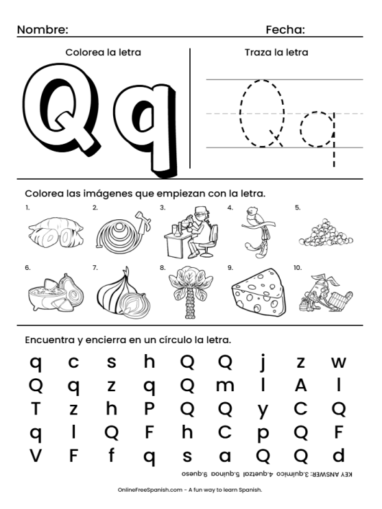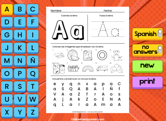 Luego debe de trazar las letras y colorear las imágenes que empiezan con la letra de la hoja de trabajo. Es importante recalcar que solo se están trabajando las imágenes que han sido previamente enseñadas en el vocabulario de cada una de las lecciones de OnlineFreeSpanish. En la parte final, el alumno debe encontrar y encerrar con un círculo la letra.